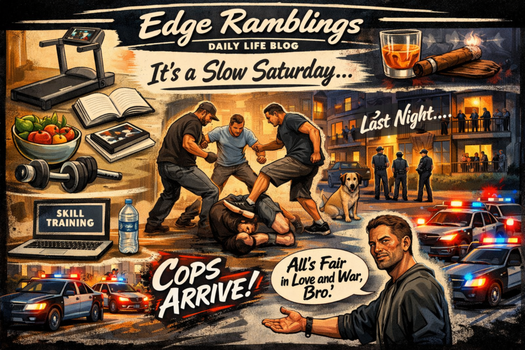 It’s a Saturday with a slow paced morning. Plans are big today, including treadmills, books both written in and read, schooling for my skillset, cleaning and clean eating. Last night while enjoying a drink and a cigar on my patio, a fight broke out on the street level between 3 men. 2 men being challenged by one man. Everyone definitely seemed agitated and aggressive, although I could quite hear all the things they were yelling at each other, but you could tell things were going to set off as they spilled out in to the street. Once the fight jumped off the one man was doing pretty well until he got caught with a punch and went down. The two men then pounced and started to punch and kick him while he turtled in to a ball yelling that “It’s Enough, It’s Enough, You Win”. It looked more like a school yard showdown than a true beating; however, they were adults and the hits were real and solid. I observed all my neighbours out on their balconies, some of them recording, some of them on the phone probably with police, but all of them watching and nobody intervening. Cars would drive around the men fighting as if they were not there. Someone from one of the balconies yelled out that the police were on their way in hopes to halt the fighting. It didn’t work. The police came tearing down the street in full force, sirens blare echoing down the hallways of all the buildings, lights dancing across all the reflective window walls. It screamed that authority was coming and it was coming fast and hard. 8 police cars showed up. The police station is only a few blocks from here so they arrived in record time and in record numbers. The fight had already disbanded, and when it did, the solo fighter approached the two men that just showed him a beatdown with hand extended to shake and saying “All’s fair in love and war Bro”. The participants didn’t scramble or leave the area with the approaching police; which surprised me a little. The cops all parked sporadically across the road in some sort of random chaotic pattern. Police exited their cars and seems to walk around with their hands inside their flack jackets questioning anyone that was around, including the fighters. A strange random stray dog came out of nowhere and sat about 15 feet away form the group of chaos and just watched. As if it’s owner was one of the group and it was just waiting until their business was done so that it could continue on it’s midnight walk. However, the dog belonged to nobody and it just hung out as a calm spectator like the dozens still standing on their balconies watching the police do their thing. Nobody seems to be searched, arrested, or even have a sense of what is going on. Police were walking around, the participants seemed to talk to one police officer then another, then to each other, all the while the road is blocked and the flashing lights spun around the condo buildings like it was a red and blue rave night. The solo fighter seemed to get some water so he could wash his face, whether that be because he had bloodied it or because he had some road dirt on it from laying face down in the street while he was getting kicked. There was definitely no sense of urgency or really a sense of how this chaos was going to conclude. And really, who’s dog was that. The pooch was intently watching and seems interested in this mish mash of cops and civilians figuring out life. Finally the fights were let go without incident, the police all talked among themselves for a bit; I would assume to draw straws on who was going to write up the paperwork on this one. Then they finally turned off the carnival lights and headed back to the station and I retired to bed. Where I closed my eyes knowing that my life no longer includes any of that chaos, chaos that I was so comfortable in as a child that my mind thought it was the norm and without it I would seek it. I slept well knowing that.
